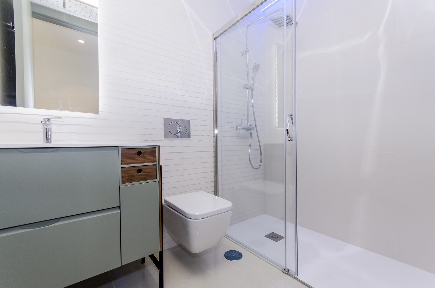 At street level the door gives access to the reception area of the apartment block where a few steps lead up to the front door of the apartment. This opens into the main living, dining and kitchen area which benefits from access to a large balcony. At the back of the kitchen is a patio with laundry area and storage. Moving through the living and kitchen area a hallway gives access to the first bedroom and courtesy bathroom and to the left of this is the master bedroom with en-suite bathroom and access to the balcony.