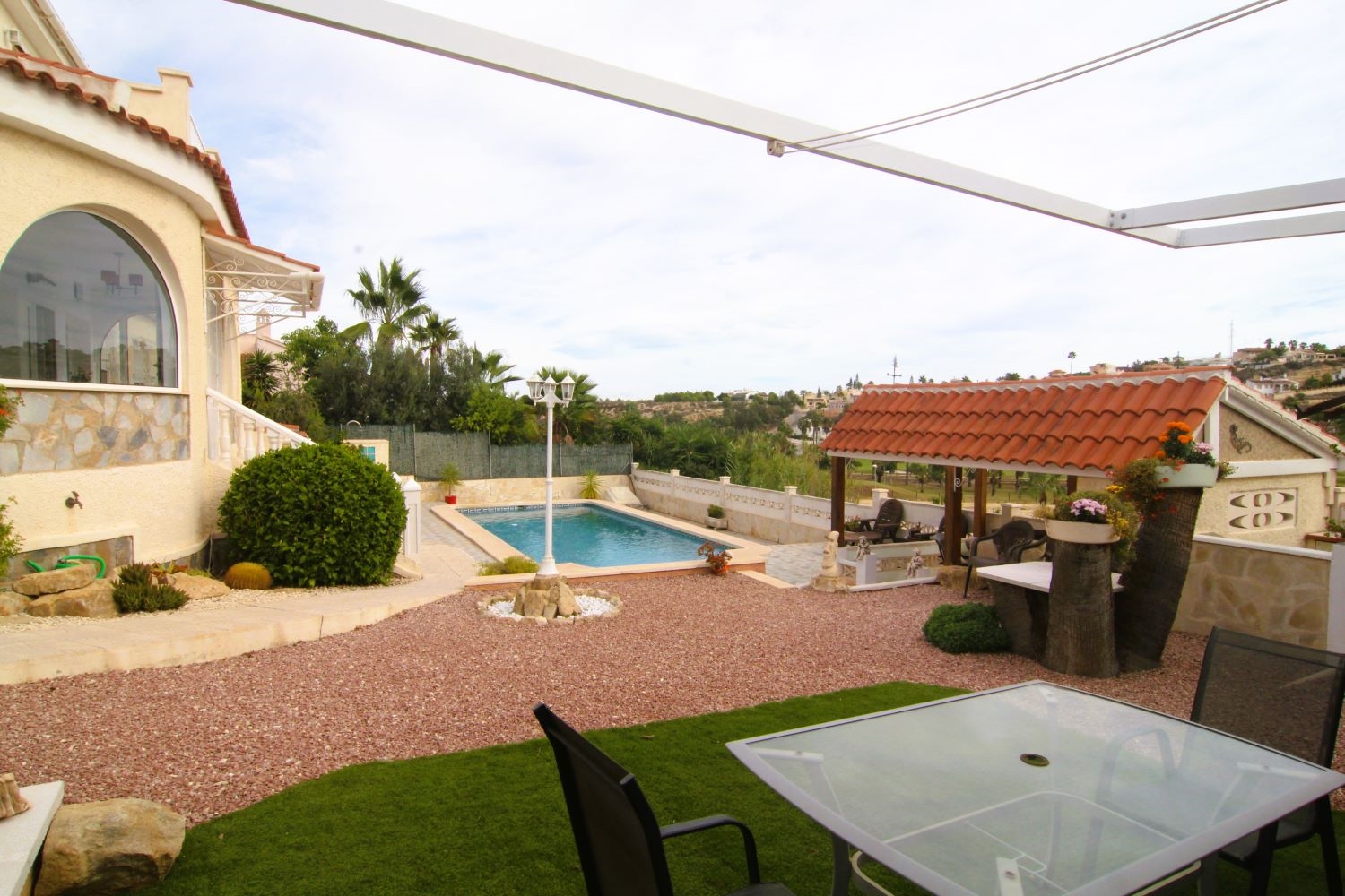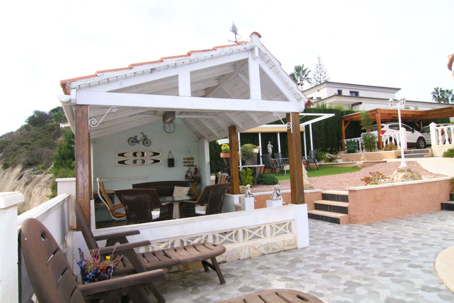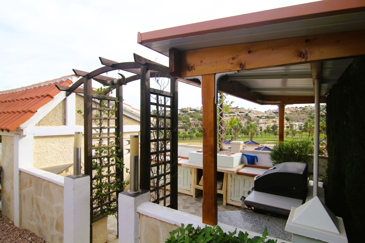 Automatic entry gates and a driveway with covered parking give access to the large plot which offers a covered BBQ area, two further covered seating areas, a fishpond and a 10x5 pool with exterior shower and views over the golf course. The garden is easy maintenance with paved and gravelled areas and dotted with fruit trees and plants plus a small workshop and external storage areas. A stairs to the side of the property lead up to the snooker room which also offers two exterior seating areas and golf course views.