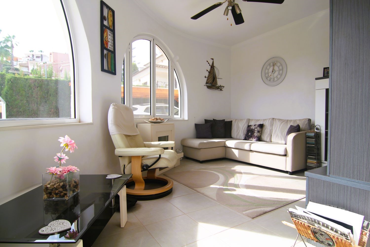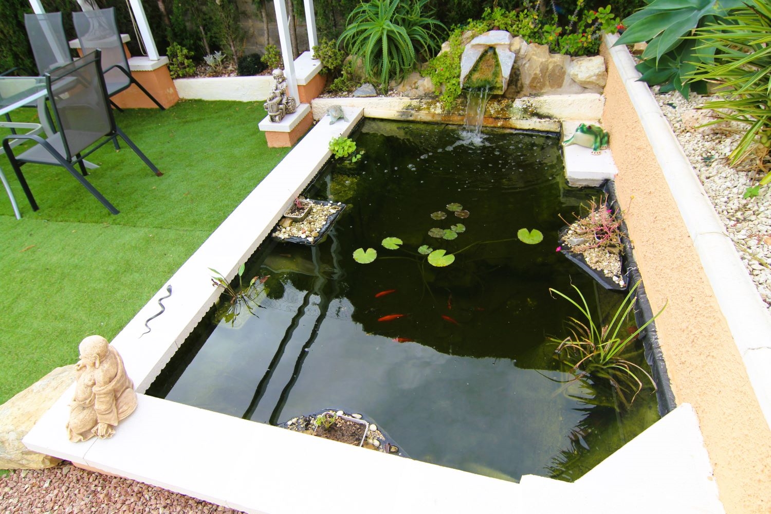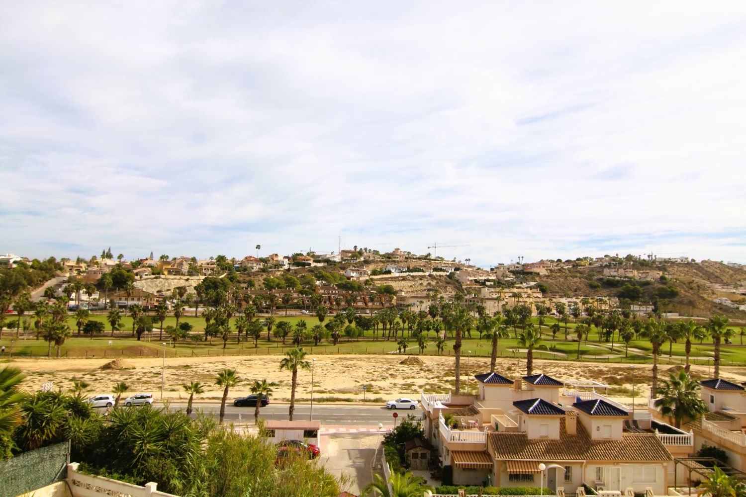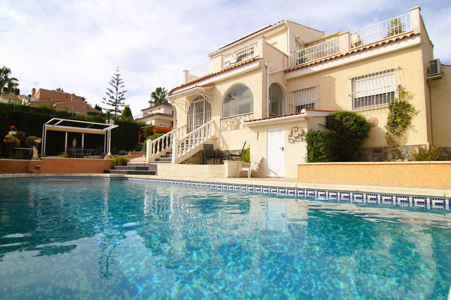 Automatic entry gates and a driveway with covered parking give access to the large plot which offers a covered BBQ area, two further covered seating areas, a fishpond and a 10x5 pool with exterior shower and views over the golf course. The garden is easy maintenance with paved and gravelled areas and dotted with fruit trees and plants plus a small workshop and external storage areas. A stairs to the side of the property lead up to the snooker room which also offers two exterior seating areas and golf course views.